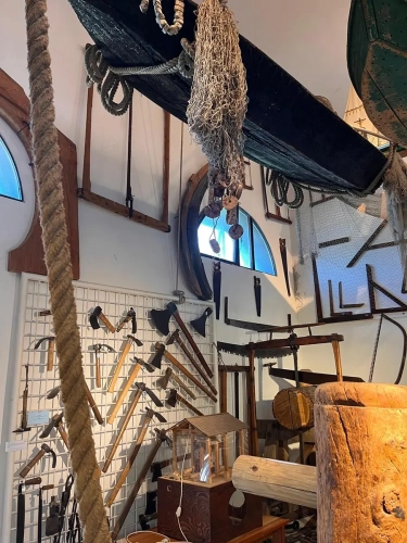 La visita prosegue nella sala successiva, dedicata al mondo della cantieristica, dove è esposta una ricca collezione di utensili e strumenti legati alle fasi di costruzione e collaudo dei natanti, nonché alle figure professionali ad esse associate.